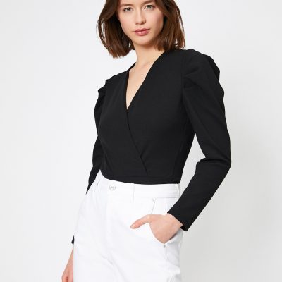 Büzgülü Uzun Kollu Kruvaze Body – Siyah